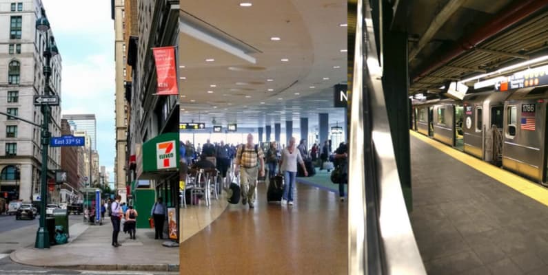 • Subway: platform, train car, passageways, braking/acceleration, tunnel rumble, doors, announcements as indistinct background noise